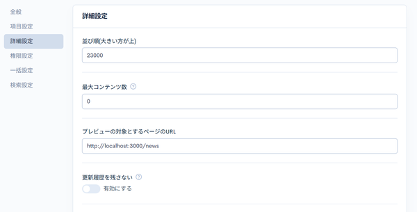 | プレビューの対象とするページのURL | コンテンツ編集でプレビュー表示をした際に表示するページのURLを設定します。 参考) KurocoとNuxt.jsで、プレビュー画面を構築する |