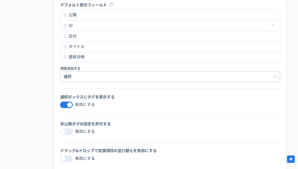 | ドラッグ&ドロップで拡張項目の並び替えを有効にする | 有効にすると繰り返しが設定された項目の並び順をドラッグ&ドロップで変更できるようになります。 |
